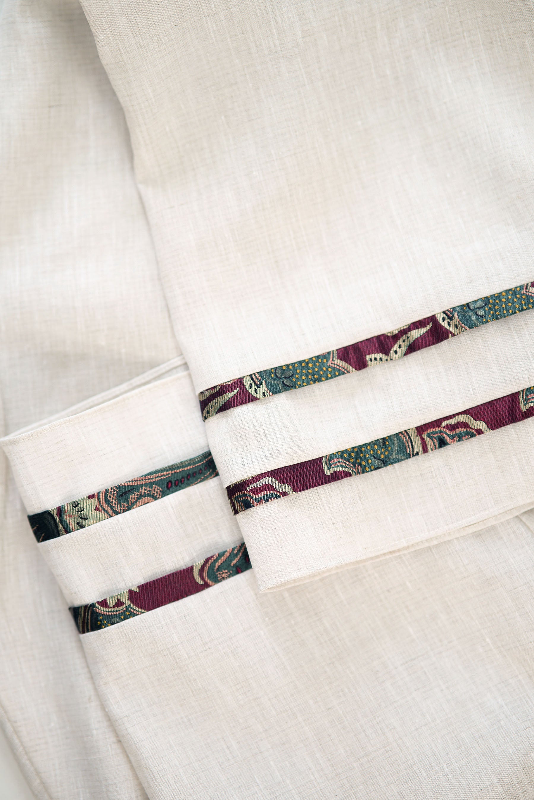 This unique shirt masterfully combines the casual charm of a camp shirt with the refined elegance of a kimono. It boasts an oversized silhouette, beautifully accented by a camp collar, creating a perfect blend of styles. Enhanced with silk jacquard trims, including dual stripes on the sleeves and a single stripe across the back yoke, it adds a modern touch to its overall appeal.