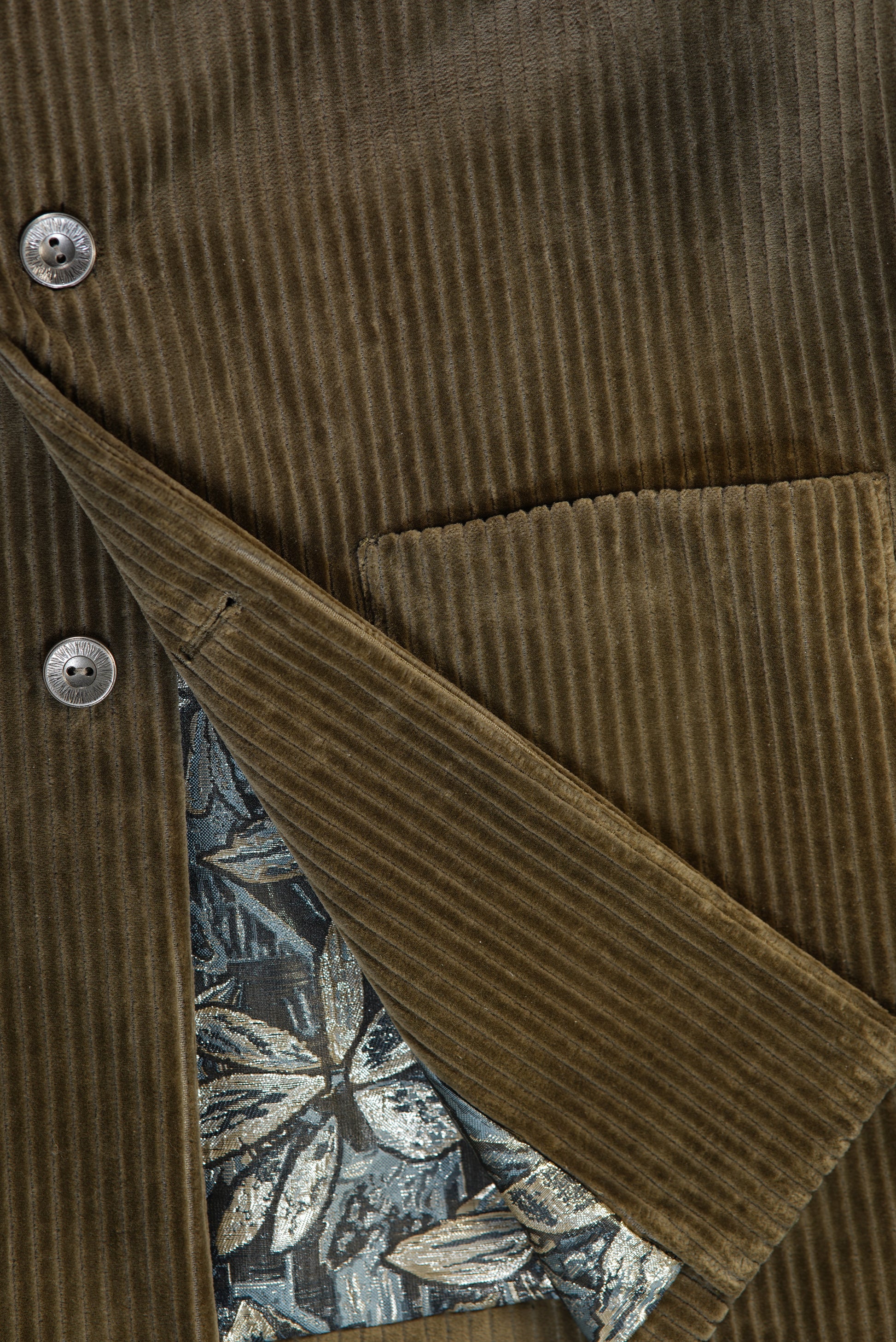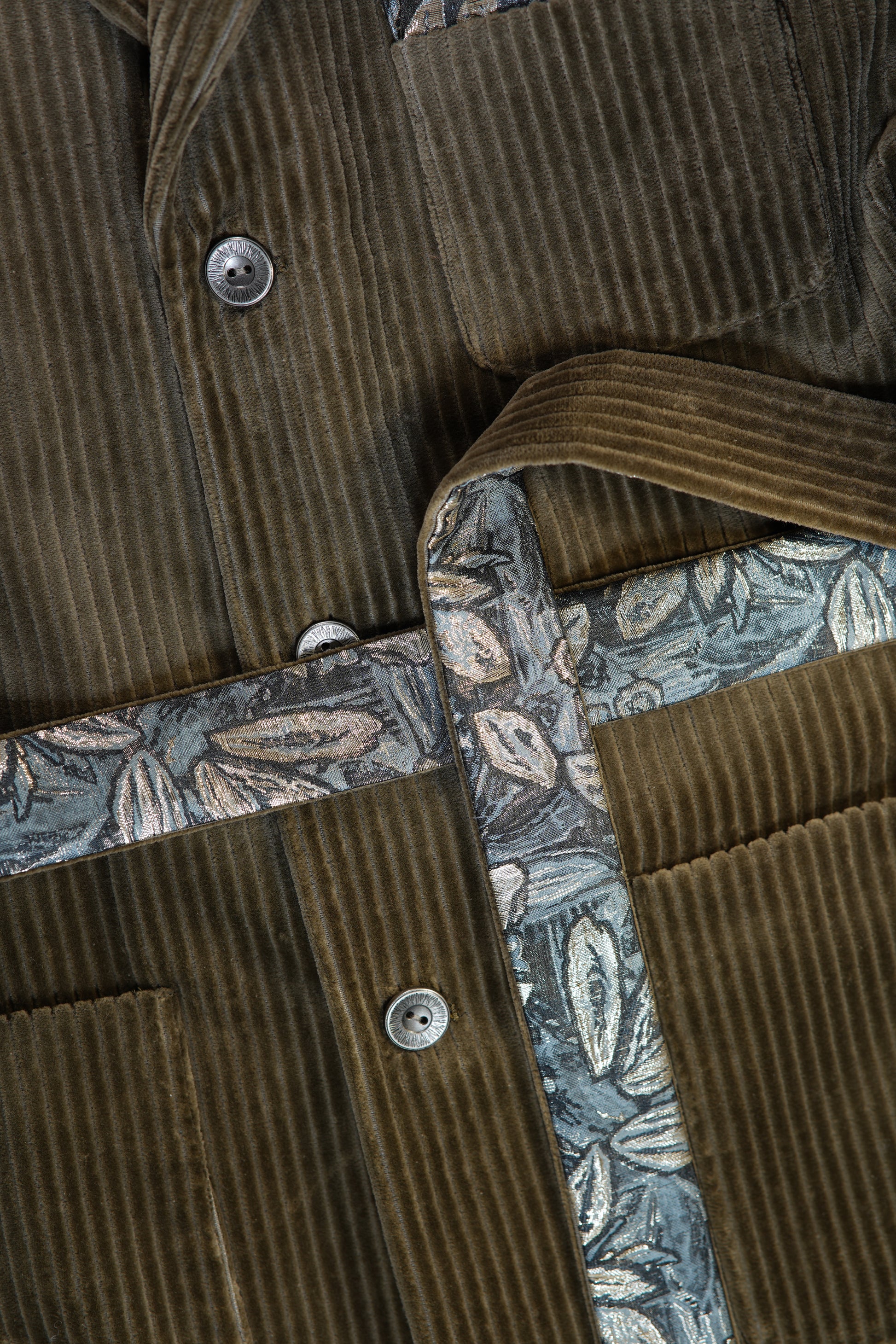 This blazer merges classic charm with modern sensibility, embodying a style that's effortlessly refined. Crafted from luxurious, heavy sage green corduroy fabric, its design draws on the traditional kimono, offering a contemporary twist with its structured, single-breasted cut cinched at the waist by a belt, complemented by a floral brocade lining.