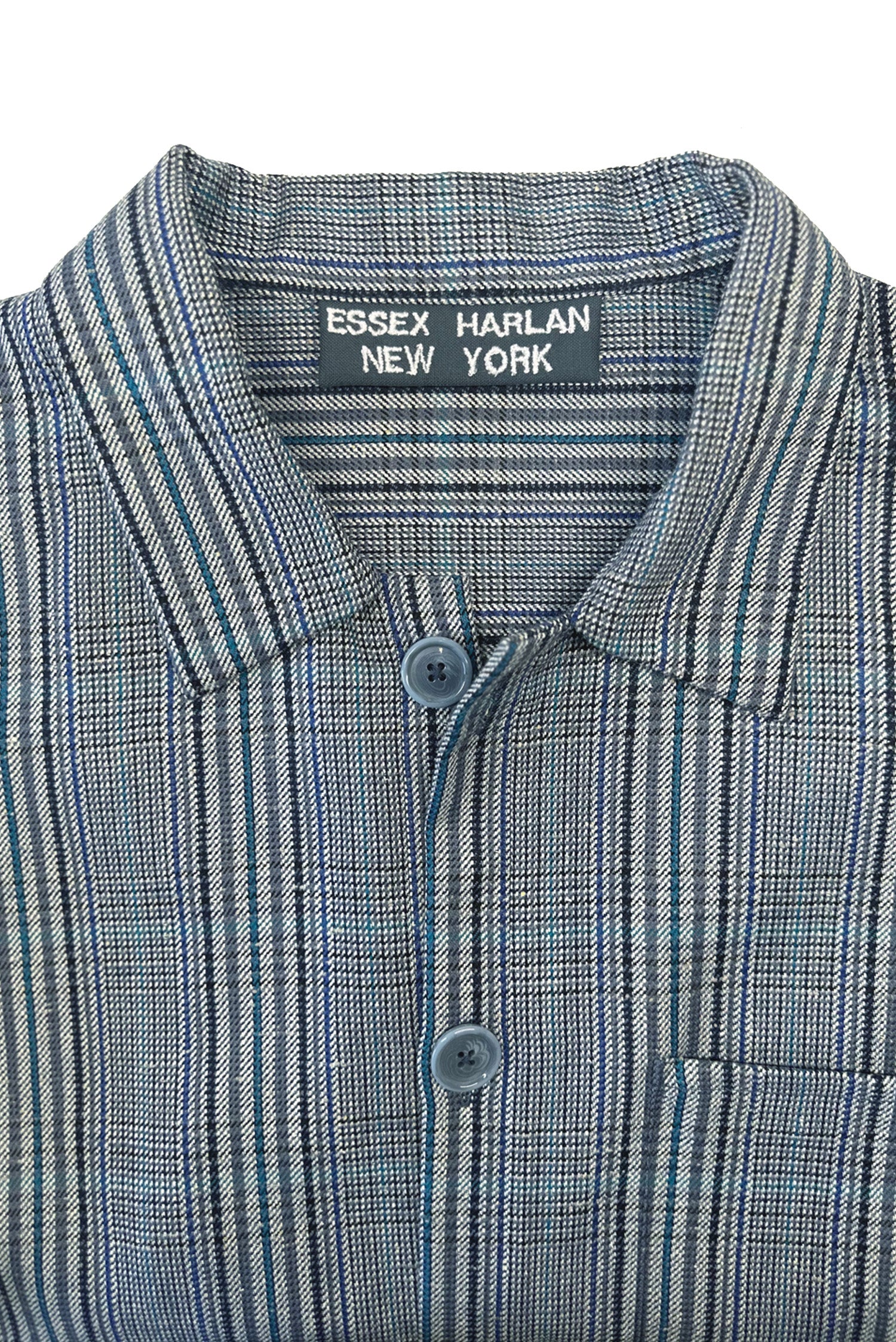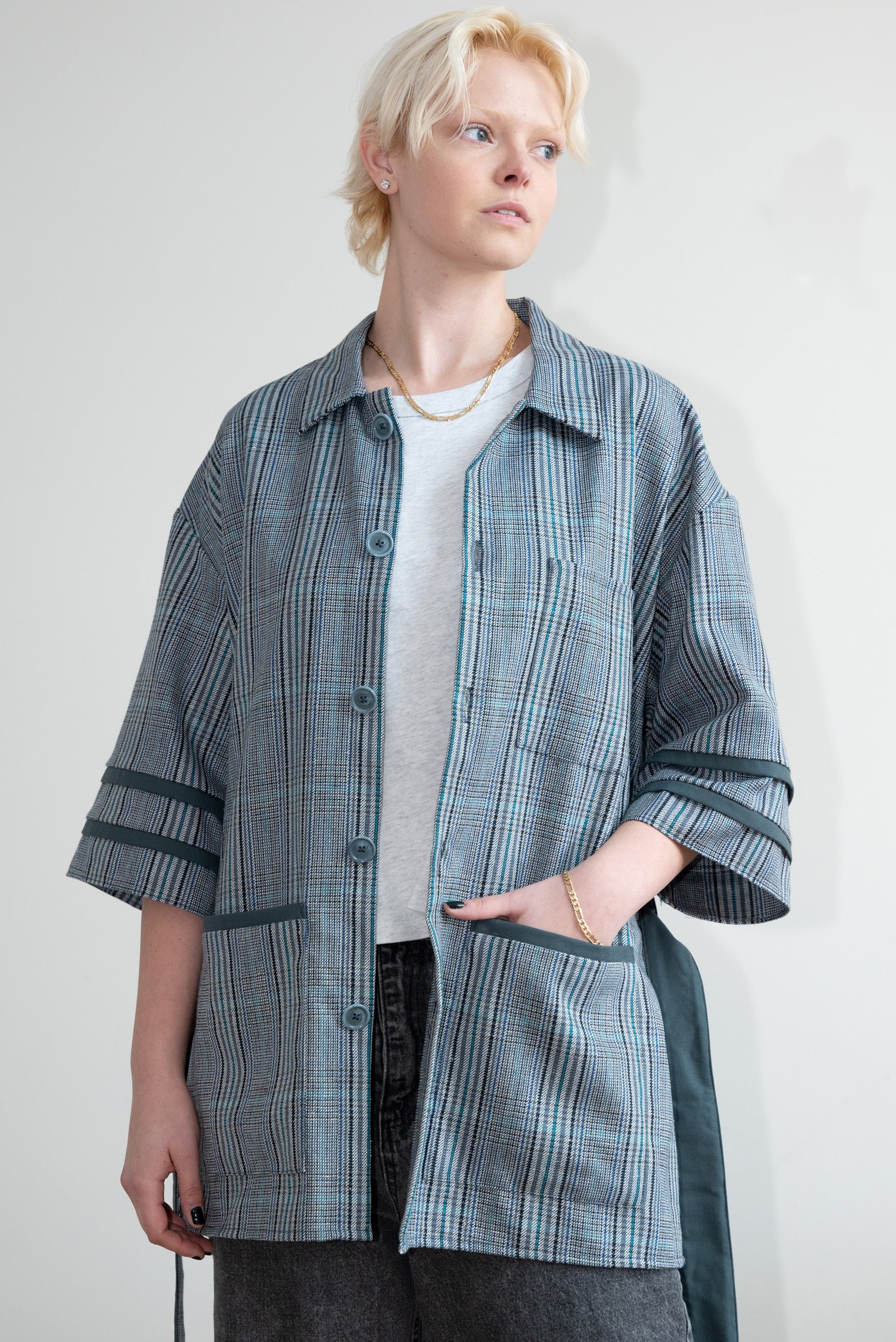 Made from classic teal gray tweed wool check with solid teal wool twill accents, it boasts dual stripes on the sleeves and a single stripe across the back yoke for contemporary elegance. A self-tie waist ensures a flattering fit for all body types. Crafted from premium wool twill renowned for its textured weave, this shirt promises superior comfort and a stylish drape, redefining casual elegance.