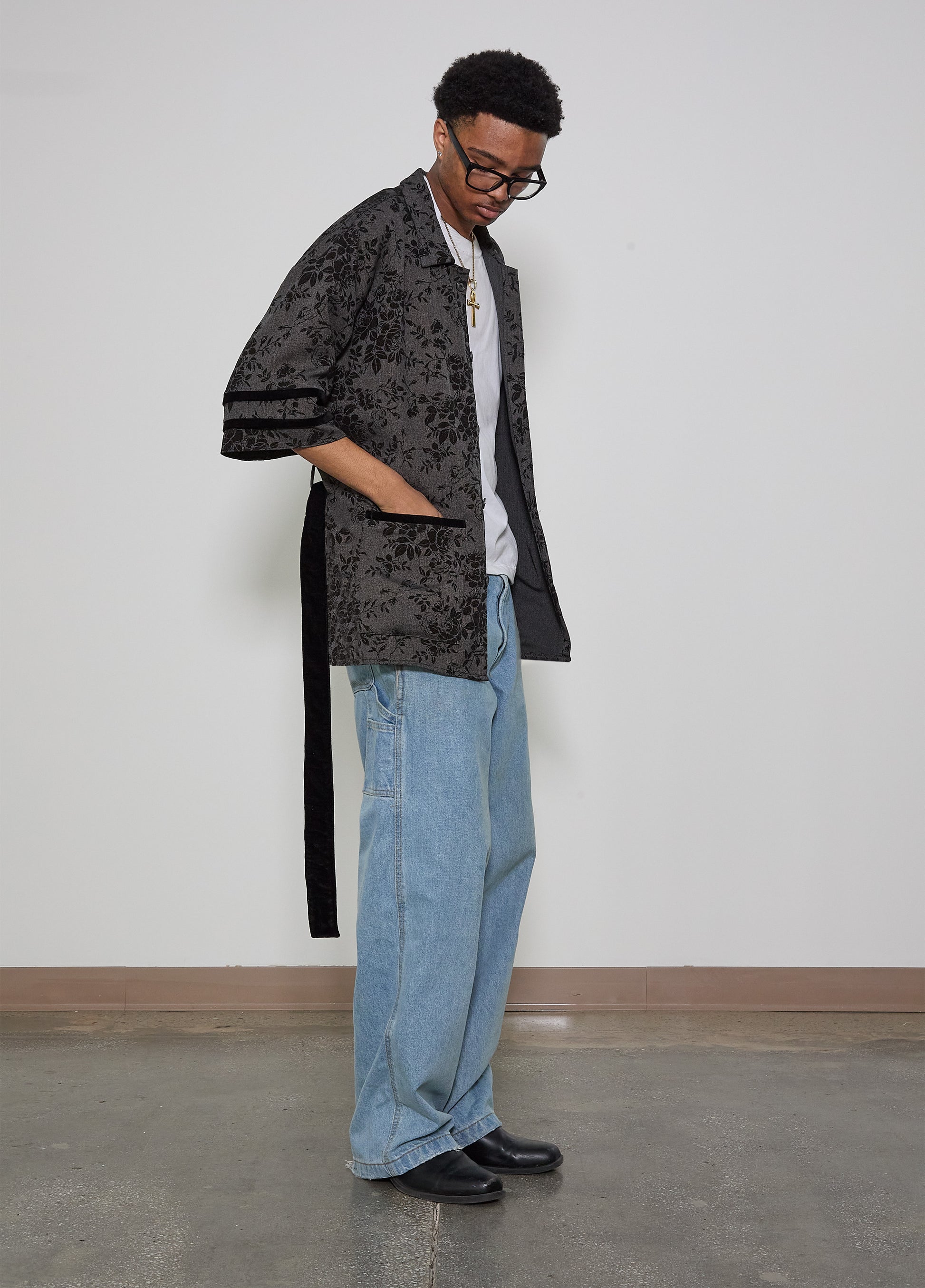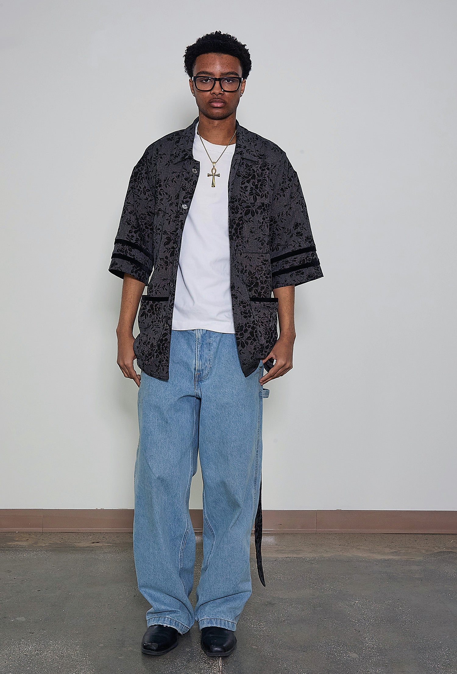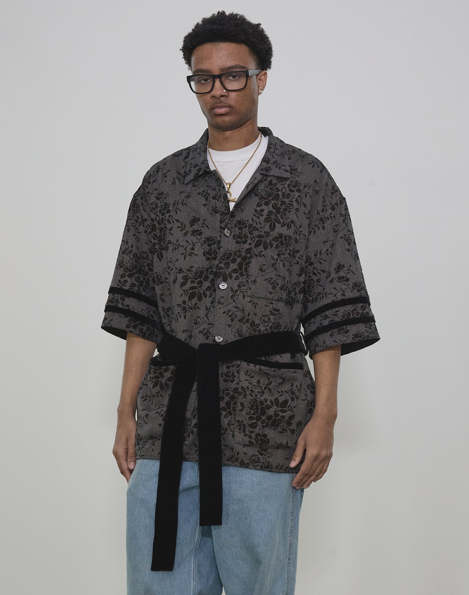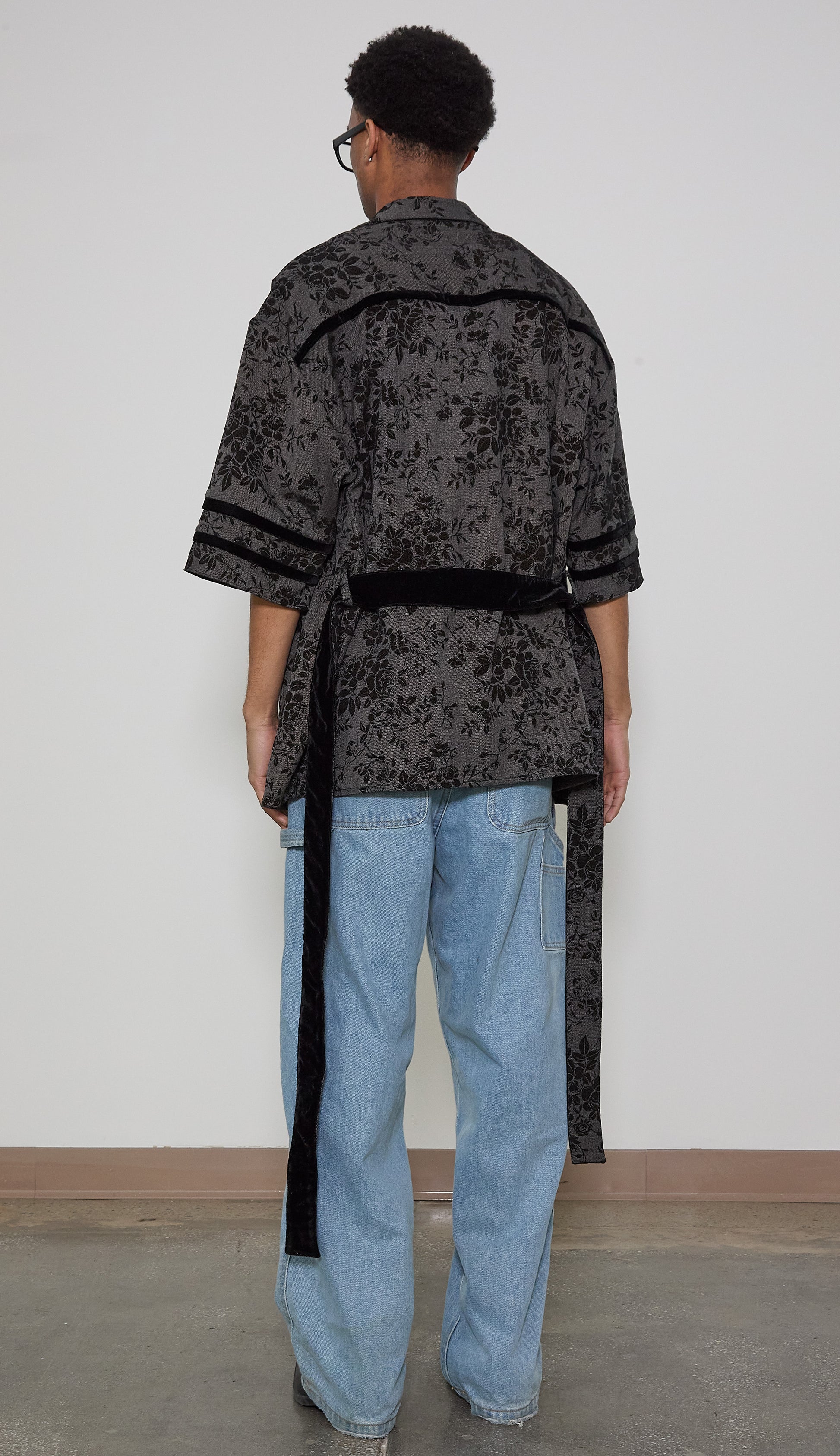 Constructed from black polyester damask, accentuated with solid black velvet detailing, this shirt features distinctive double stripes along the sleeves and a singular stripe across the back yoke, adding a touch of modern sophistication. It comes with a self-tie belt, accommodating various body shapes and ensuring both a perfect fit and unrivaled comfort. This shirt stands out by offering a luxurious drape, setting a new standard for relaxed yet refined style.