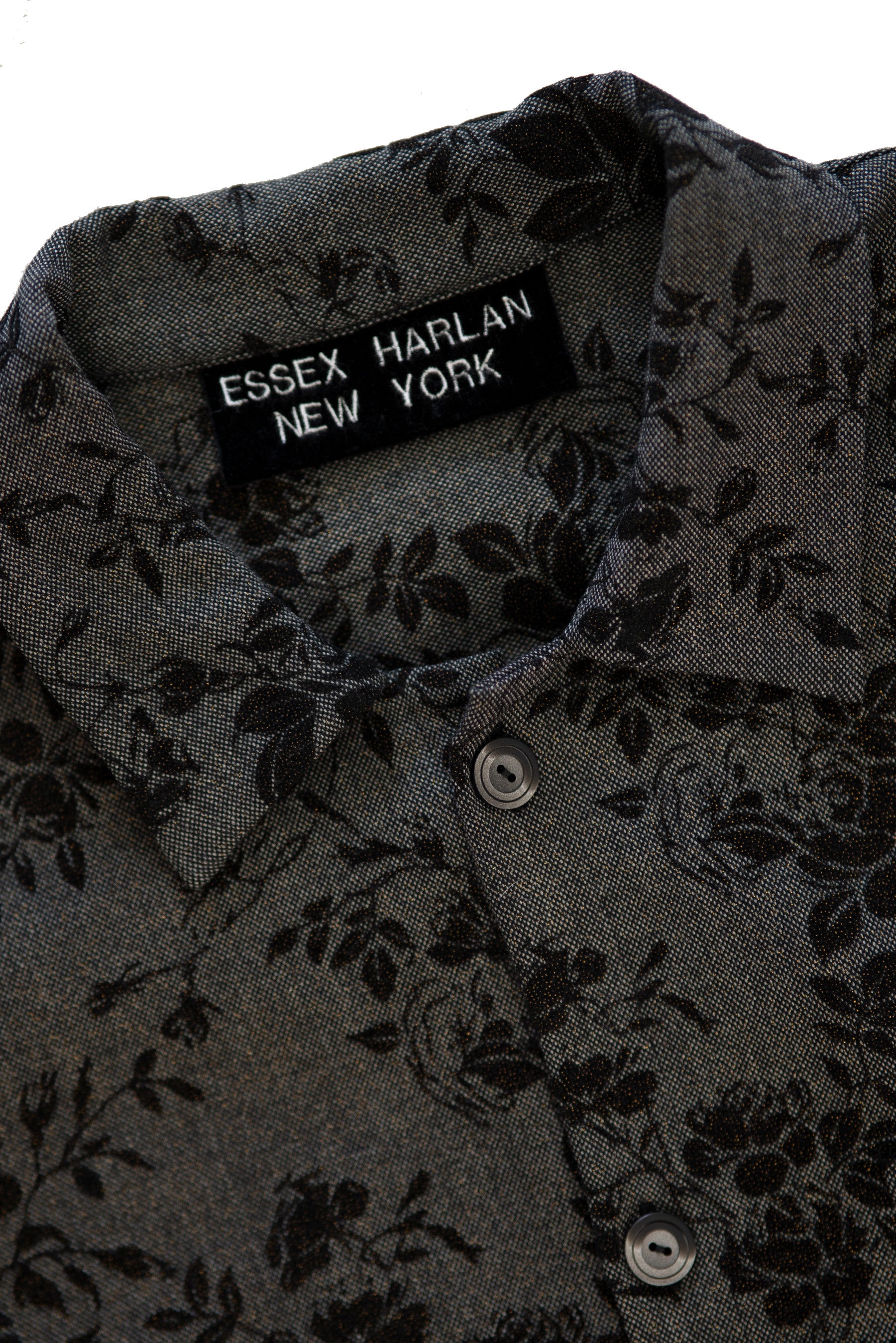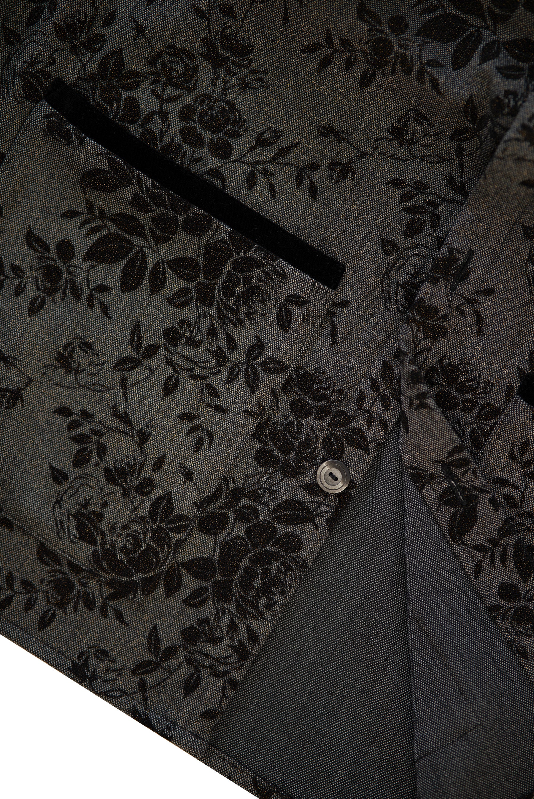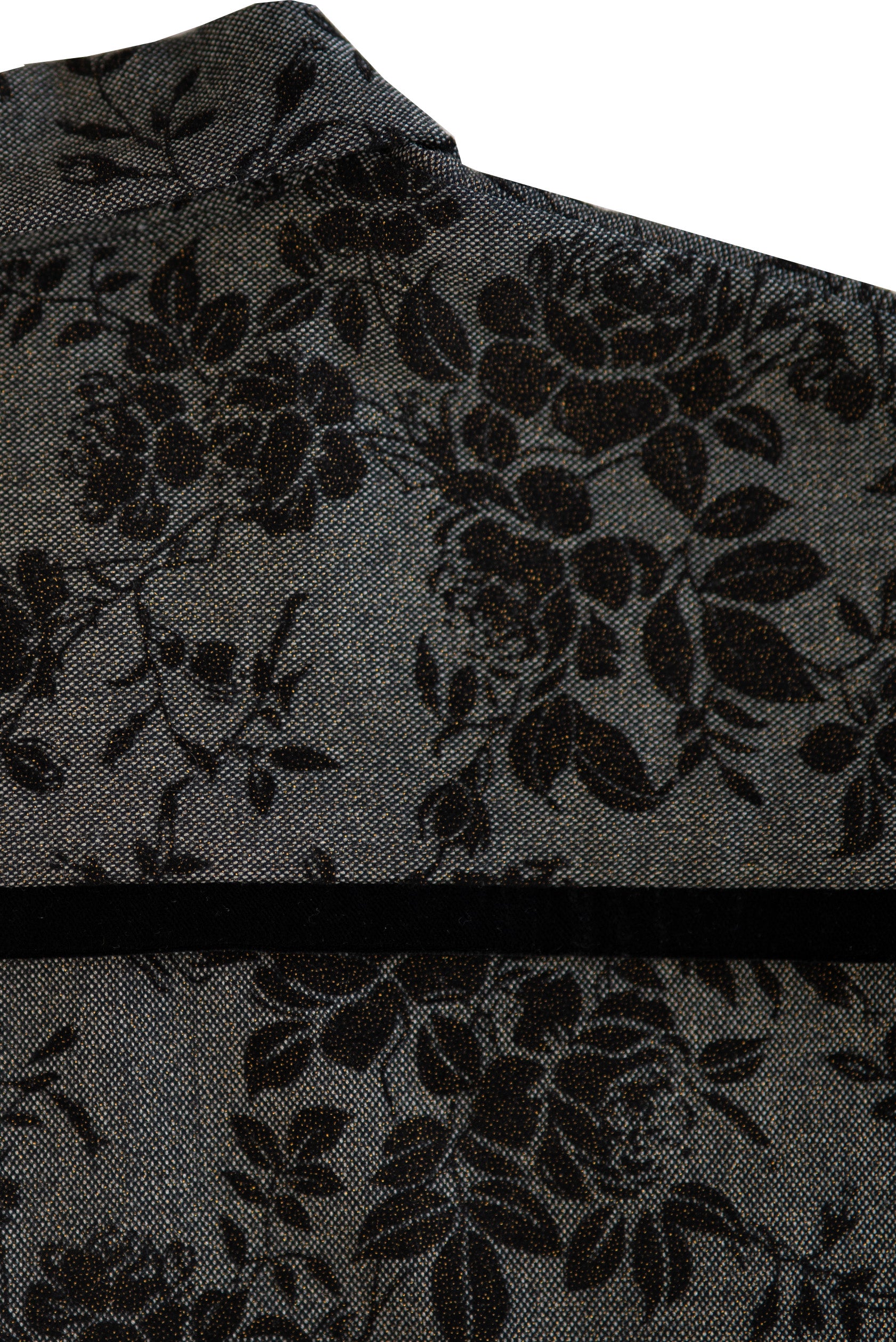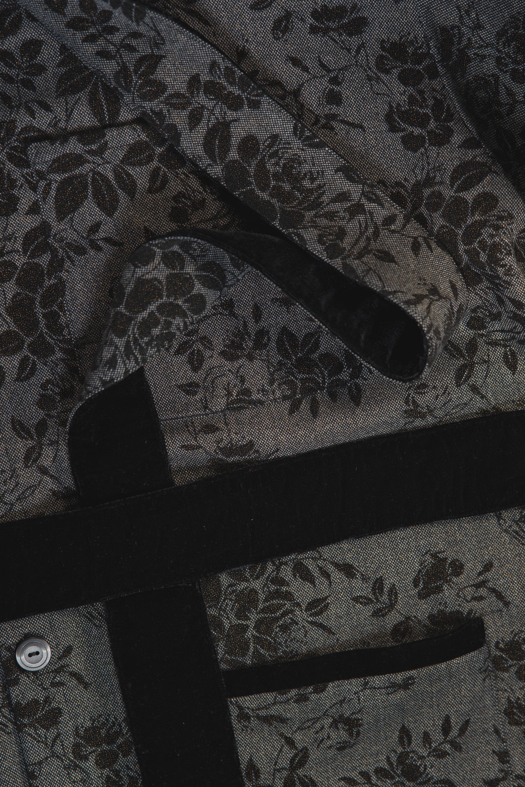 Constructed from black polyester damask, accentuated with solid black velvet detailing, this shirt features distinctive double stripes along the sleeves and a singular stripe across the back yoke, adding a touch of modern sophistication. It comes with a self-tie belt, accommodating various body shapes and ensuring both a perfect fit and unrivaled comfort. This shirt stands out by offering a luxurious drape, setting a new standard for relaxed yet refined style.