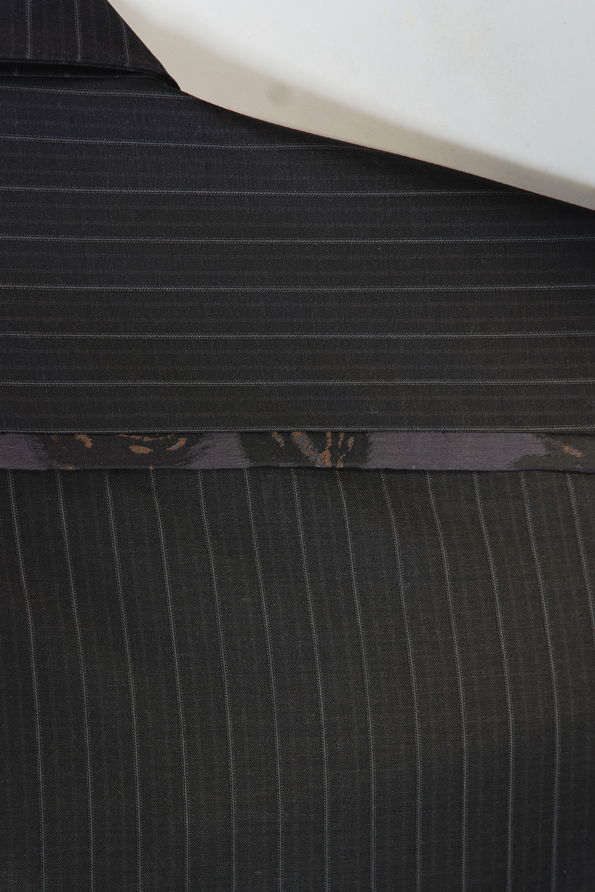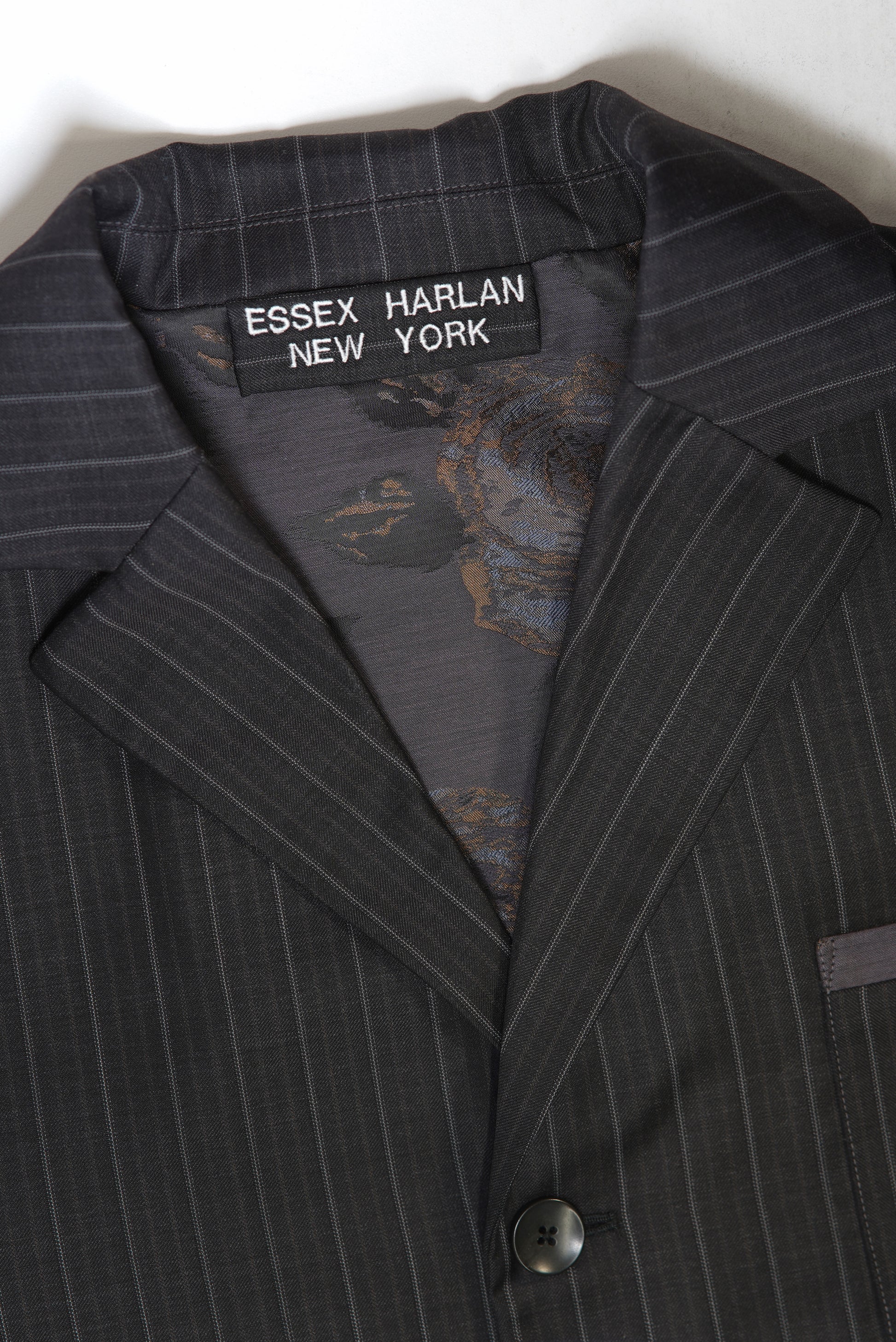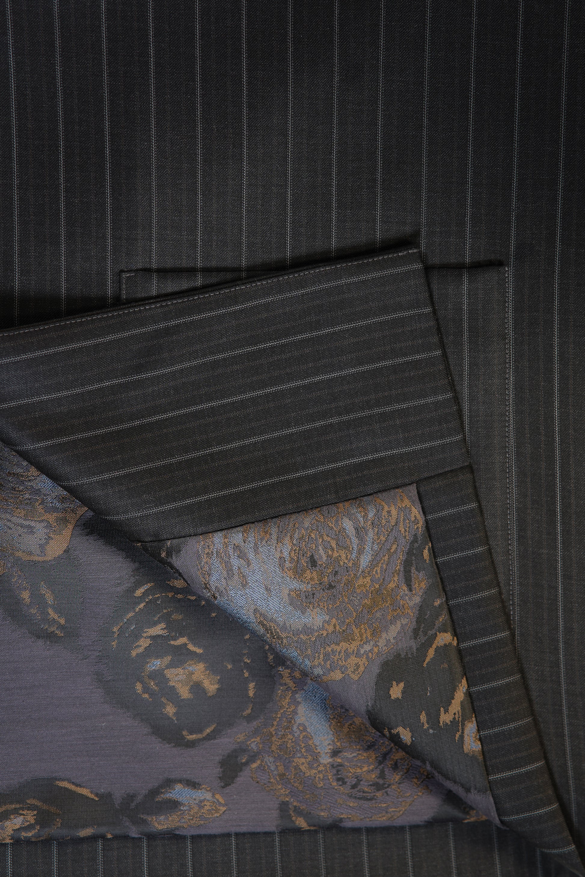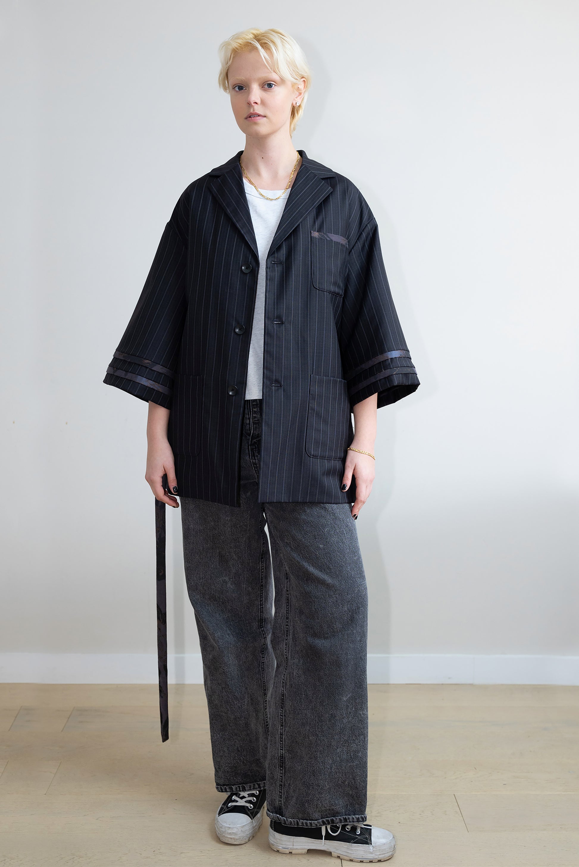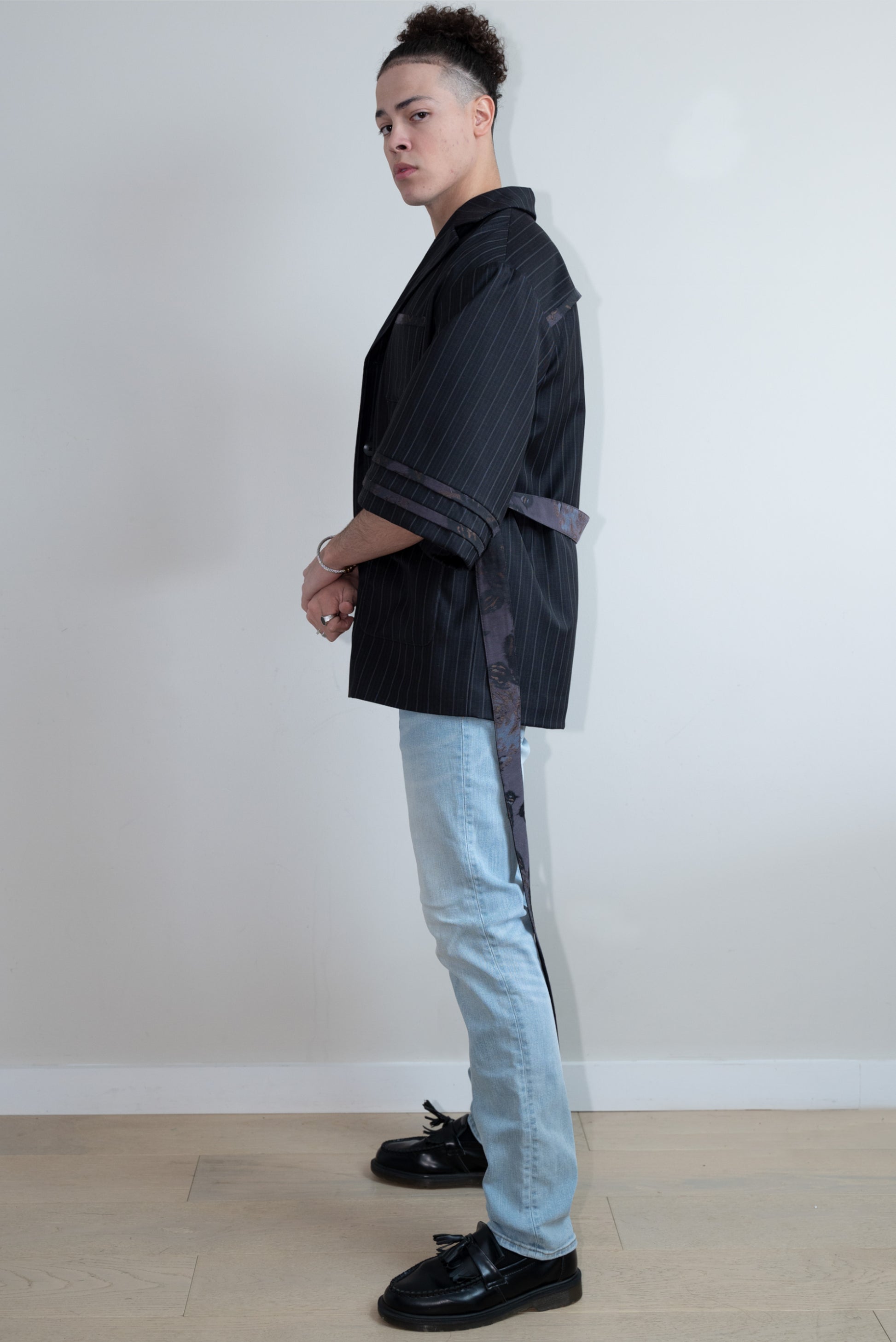 It is fully lined with floral cotton jacquard, subtly nodding to the classic checks typical of brushed wool blends, showcasing understated sophistication while seamlessly blending heritage with contemporary design. The blazer is tailored from premium black striped twill suiting fabric; it features a single-breasted silhouette gracefully cinched at the waist with a belt.